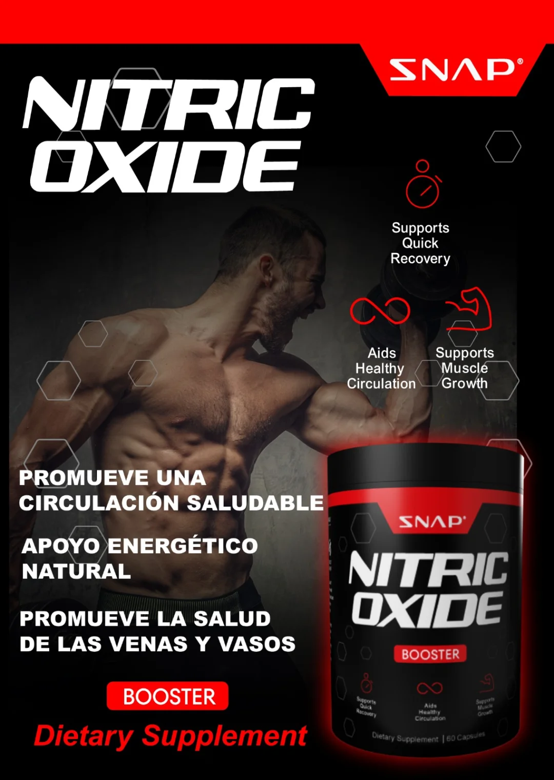 SNAP Nitric Oxide Booster es un suplemento natural diseñado para potenciar el rendimiento físico, mejorar la circulación y apoyar el crecimiento muscular, ayudando a lograr entrenamientos más intensos y una recuperación más rápida.